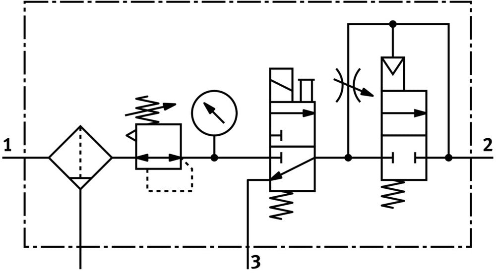 This air preparation unit combines essential pneumatic components in a compact package. It features a G1/8 pneumatic connection and delivers a standard nominal flow rate of 595 l/min. The unit offers pressure regulation from 2.5 to 12 bar, with a 40 µm filtration grade. Designed for technical applications, it integrates a shut-off valve, filter regulator with pressure gauge, proportional standard oil mist lubricator, and safety start-up valve. This comprehensive solution ensures efficient and reliable air preparation for pneumatic systems.