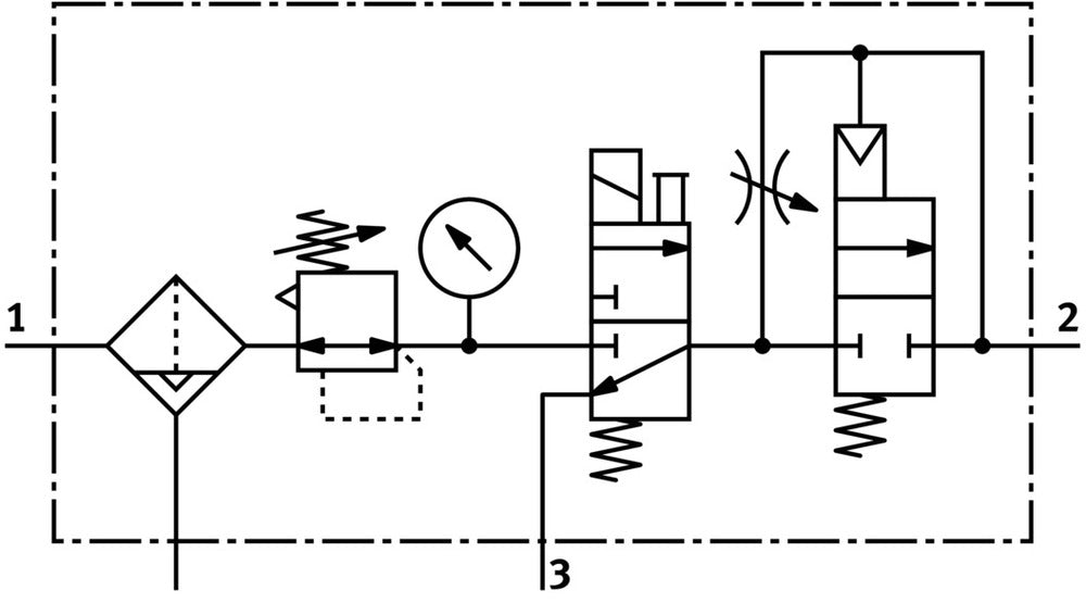 This air preparation unit combines essential components for pneumatic systems, including a shut-off valve, filter regulator with pressure gauge, proportional standard oil mist lubricator, and safety start-up valve. With a G3/8 pneumatic connection and a standard nominal flow rate of 1890 l/min, it offers efficient air management. The unit features a pressure regulation range of 2.5 - 12 bar and a 40 µm grade of filtration, ensuring reliable performance and protection for downstream equipment in industrial pneumatic applications.