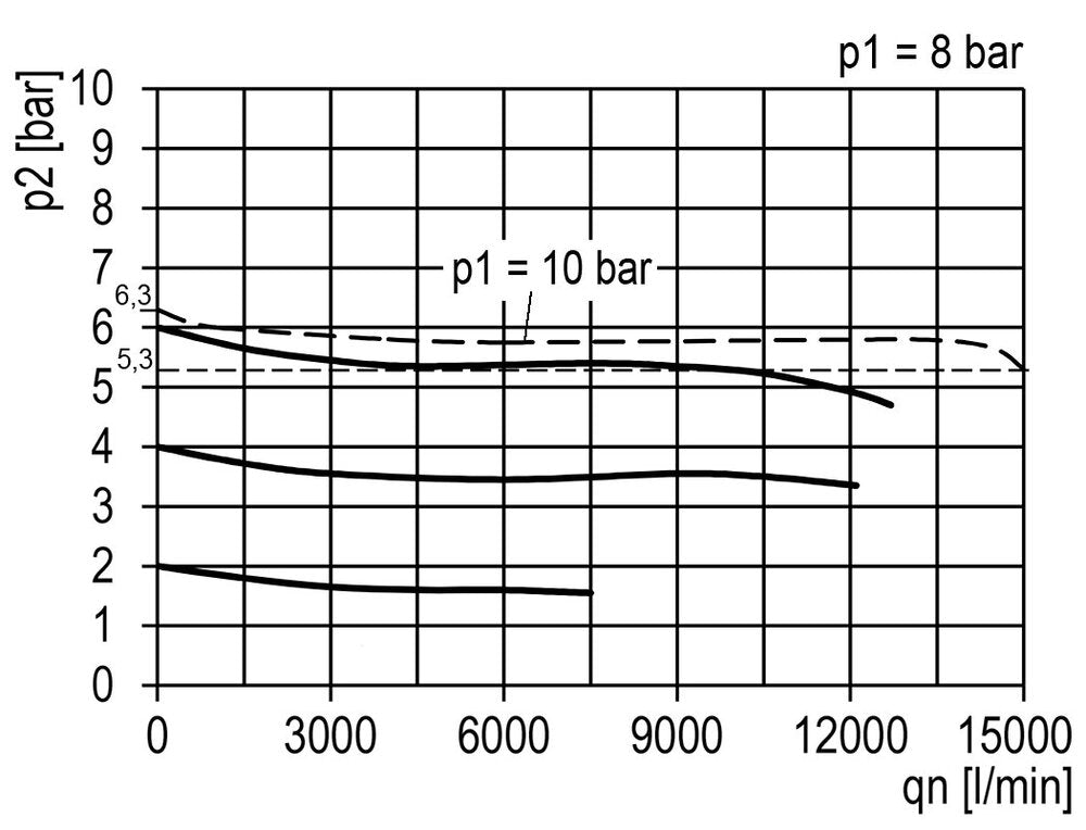 This filter regulator (FR) combines two functions. The filter removes water, dirt and other harmful particles larger than 40 microns. The pressure regulator adjusts the pressure continuously to a stable level, even when the input pressure varies. The level can be adjusted between 0.2 to 6.0 bar (3 to 87 psi). This model has G 1 inch ports. The maximum flow rate is 15000 l/min. Please note that the maximum flow rate alone doesn't provide enough information to proper sizing. Use the flow curve to determine if the pressure drop (droop) within your expected flow rate range is acceptable. The flow curve shows the flow rate for a set input pressure with multiple output pressures. For each output pressure, it can be seen how the pressure changes with increasing flow rate. It is recommended to use the device in the flat range of the curve, and not on the beginning or the end of the curve. Note that the pressure regulator controls the output pressure, not the flow rate. The output pressure can be adjusted by pulling the hand wheel up and twisting. It can be locked after adjustment by pushing the hand wheel back in.