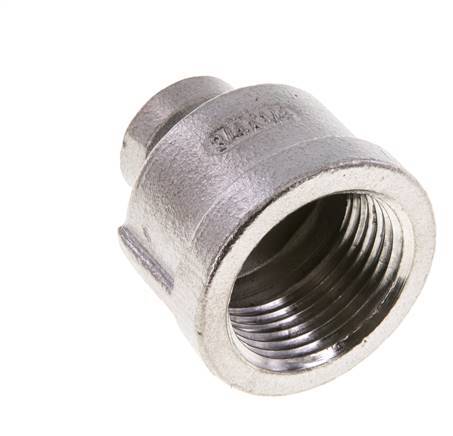 This sleeve (reducing socket) is designed with reducing NPT threads (round body). Connection 1 has female NPT 3/4 inch threads. Connection 2 has female NPT 1/4 inch threads. It is a straight fitting. It is made out of stainless steel (1.4408). At 20 °C (68 °F), it can handle a maximum pressure of 16 bar (232 psi).