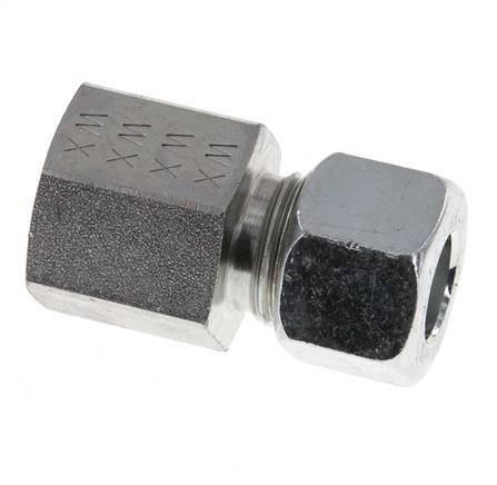 This straight screwed-on screw connections is designed with female threads and a cutting ring connection point. Connection 1 has female G 3/8 inch threads. Connection 2 is a 12 mm cutting ring. It is a straight fitting. It is made out of steel and is galvanic/electrolytic zinc plated for surface protection. It is suitable for media within a temperature range of -40 °C to 120 °C (-40 °F to 248 °F). At 20 °C (68 °F), it can handle a maximum pressure of 315 bar (4569 psi). According to the DIN 2353, it has an L (light) load class. It is made in accordance with the DIN EN ISO 8434-1 (DIN 2353). They have a 3-part design.