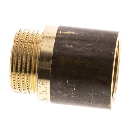 This extension is designed with male and female threads. Connection 1 has female G 3/4 inch threads. Connection 2 has male G 3/4 inch threads. It is a straight fitting. It is made out of brass. It has a total length of 30 mm. It is made in accordance with the DIN 3523.