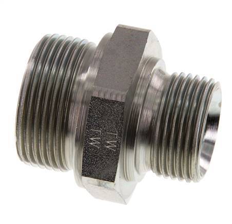 This steel double nipple is designed with male to male threads. Connection 1 has male G 1 1/4 inch threads. Connection 2 has male G 1 inch threads. Max pressure of 315 bar (4569 psi). It has a 60° conical inside the male threads.