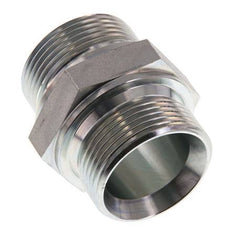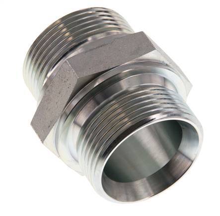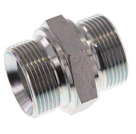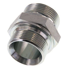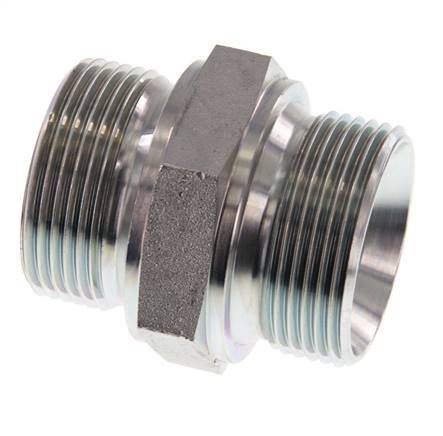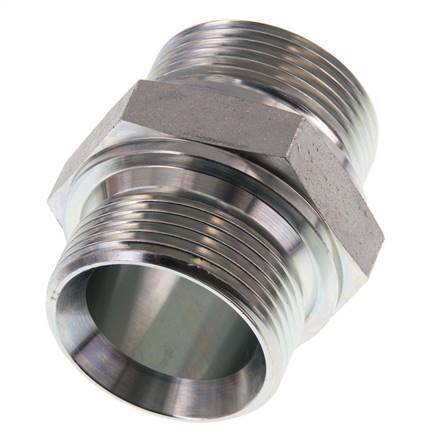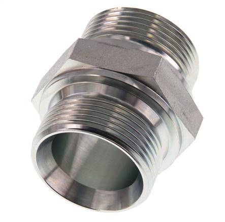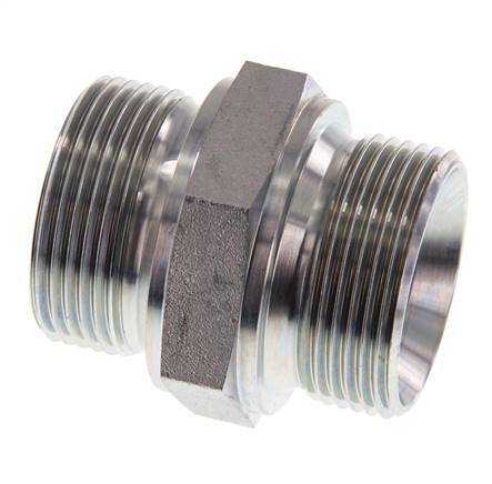 This steel double nipple is designed with male to male threads. Connection 1 has male G 1 1/4 inch threads. Connection 2 has male G 1 1/4 inch threads. Max pressure of 315 bar (4569 psi). It has a 60° conical inside the male threads.