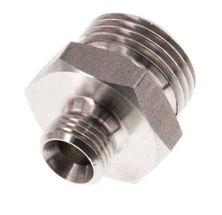 This double nipple is designed with male to male threads. Connection 1 has male G 3/8 inch threads. Connection 2 has male G 1/8 inch threads. It is a straight fitting. It is made out of stainless steel (1.4571). At 20 °C (68 °F), it can handle a maximum pressure of 40 bar (580 psi). It has a 19 mm nut to be tightened with a wrench.
