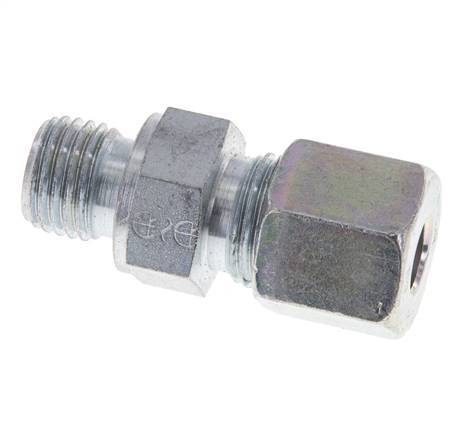 This straight screw in connection is designed with male threads and a cutting ring fitting connection. Connection 2 is a 8 mm cutting ring. It is a straight fitting. It is made out of steel and is galvanic/electrolytic zinc plated for surface protection. It is suitable for media within a temperature range of -40 °C to 120 °C (-40 °F to 248 °F). At 20 °C (68 °F), it can handle a maximum pressure of 630 bar (9138 psi). According to the DIN 2353, it has an S (heavy) load class. It is made in accordance with the DIN EN ISO 8434-1 (DIN 2353). They have a 3-part design.