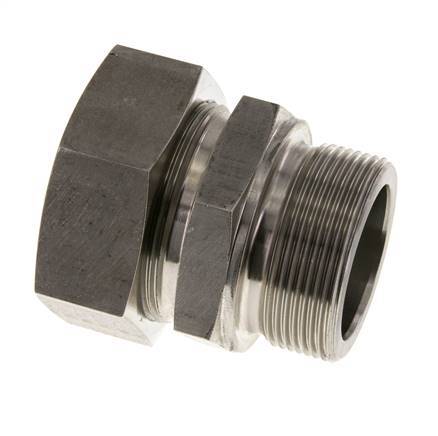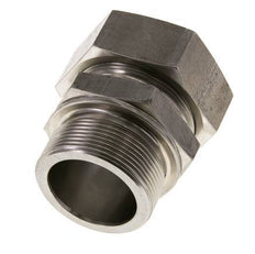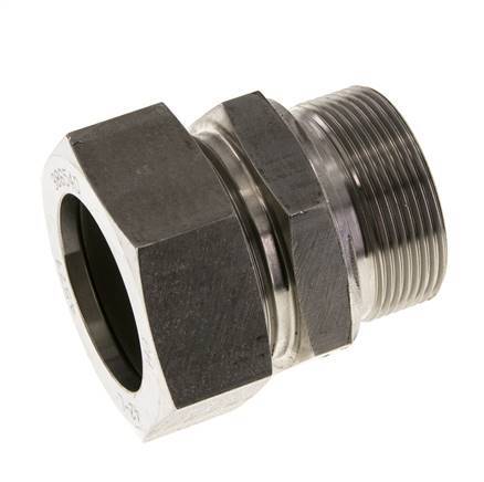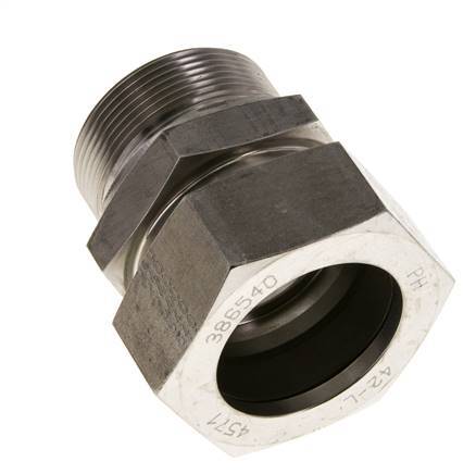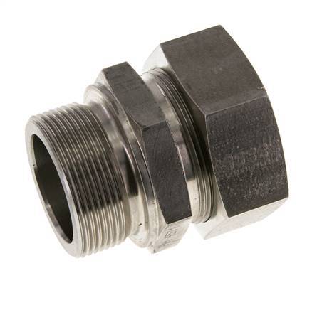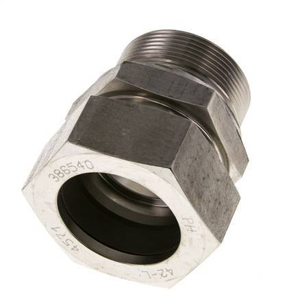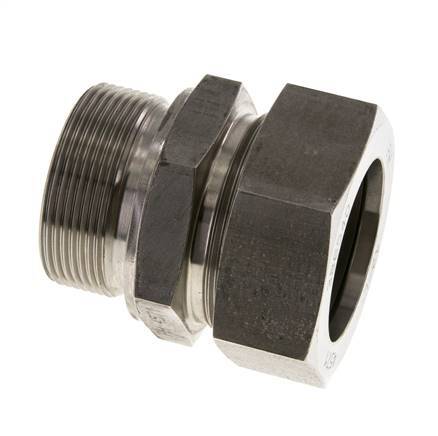 This straight screw in connection is designed with male threads and a cutting ring fitting connection. Connection 2 is a 42 mm cutting ring. It is a straight fitting. It is made out of stainless steel (1.4571). It is suitable for media within a temperature range of -60 °C to 400 °C (-76 °F to 752 °F). At 20 °C (68 °F), it can handle a maximum pressure of 160 bar (2321 psi). According to the DIN 2353, it has an L (light) load class. It is made in accordance with the DIN EN ISO 8434-1 (DIN 2353). They have a 3-part design.