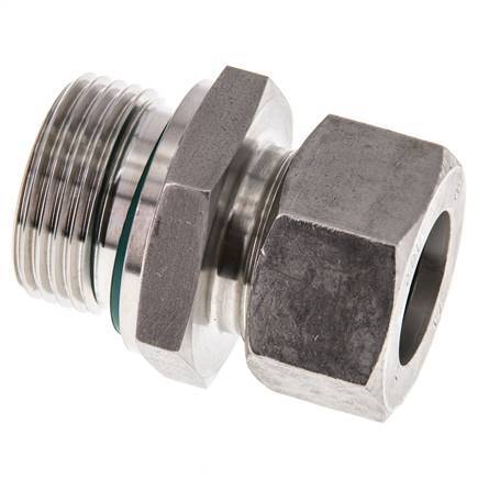 This stainless steel straight screw in connection is designed with male threads and a cutting ring fitting connection. Connection 1 has male G 1 inch threads. Connection 2 is a 22 mm cutting ring. The sealing is FKM / PTFE. Suitable for temperatures from -20 °C to 200 °C (-4 °F to 392 °F). Max pressure of 160 bar (2321 psi). Rated for an L (light) load class. It is made in accordance with the DIN EN ISO 8434-1 (DIN 2353).