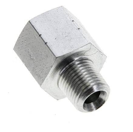 This steel extension is designed with male and female threads. Connection 1 has male NPT 1/8 inch threads. Connection 2 has female NPT 1/8 inch threads. Max pressure of 345 bar (5004 psi).