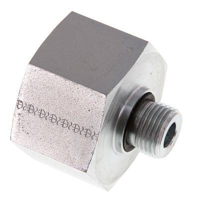 This steel threaded reduction is designed with cylindrical male and female threads. Connection 1 has male G 1/2 inch threads. Connection 2 has female G 1 1/4 inch threads. The sealing is elastomer. Max pressure of 400 bar (5802 psi).