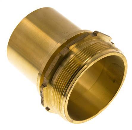 This hose screw connection is designed with a nozzle and a male thread. Connection 1 has male G 3 inch threads. Connection 2 is a hose pillar, designed for a hose with an inner diameter of 75 mm. It is a straight fitting. It is made out of brass. It is made in accordance with the EN 14420-5 (DIN 2817).