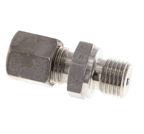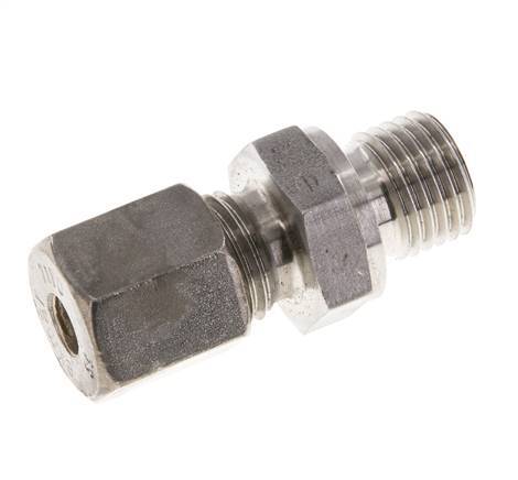This stainless steel straight screw in connection is designed with male threads and a compression ring fitting connection. Connection 2 is a 6 mm compression ring. Suitable for temperatures from -60 °C to 400 °C (-76 °F to 752 °F). Max pressure of 630 bar (9138 psi). Rated for an S (heavy) load class. It is made in accordance with the DIN EN ISO 8434-1 (DIN 2353).