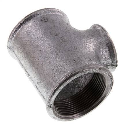 This T-piece is designed with 3 female threaded ports in a T shape. Connection 1 has Rp 2 inch threads. Connection 2 has Rp 2 inch threads. Connection 3 has Rp 1 1/4 inch threads. It is made out of cast iron (malleable) and is galvanic/electrolytic zinc plated for surface protection. At 20 °C (68 °F), it can handle a maximum pressure of 25 bar (363 psi).