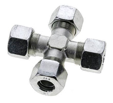 This cross screw connection is designed with four cutting ring connection ports in a cross shape. Connection 1 is a 16 mm cutting ring. Connection 2 is a 16 mm cutting ring. Connection 3 is a 16 mm cutting ring. Connection 4 is a 16 mm cutting ring. It is made out of steel and is galvanic/electrolytic zinc plated for surface protection. It is suitable for media within a temperature range of -40 °C to 120 °C (-40 °F to 248 °F). At 20 °C (68 °F), it can handle a maximum pressure of 400 bar (5802 psi). According to the DIN 2353, it has an S (heavy) load class. It is made in accordance with the DIN EN ISO 8434-1 (DIN 2353).