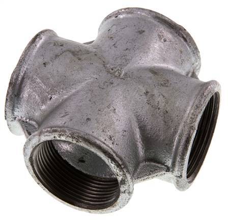 This crosspiece is designed with four female threaded connection ports. Connection 1 has Rp 1 1/2 inch threads. Connection 2 has Rp 1 1/2 inch threads. Connection 3 has Rp 1 1/2 inch threads. Connection 4 has Rp 1 1/2 inch threads. It is made out of cast iron (malleable) and is galvanic/electrolytic zinc plated for surface protection. At 20 °C (68 °F), it can handle a maximum pressure of 25 bar (363 psi).