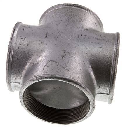 This crosspiece is designed with four female threaded connection ports. Connection 1 has Rp 3 inch threads. Connection 2 has Rp 3 inch threads. Connection 3 has Rp 3 inch threads. Connection 4 has Rp 3 inch threads. It is made out of cast iron (malleable) and is galvanic/electrolytic zinc plated for surface protection. At 20 °C (68 °F), it can handle a maximum pressure of 25 bar (363 psi).