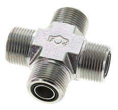 This ORFS cross screw connection is designed with four male ORFS connection ports in a cross formation. Connection 1 has ORFS male UNS 1inch-14 threads. Connection 2 has ORFS male UNS 1inch-14 threads. Connection 3 has ORFS male UNS 1inch-14 threads. Connection 4 has ORFS male UNS 1inch-14 threads. It comes with a gasket to ensure a proper seal can be made. It is made out of steel and is galvanic/electrolytic zinc plated for surface protection. At 20 °C (68 °F), it can handle a maximum pressure of 400 bar (5802 psi).