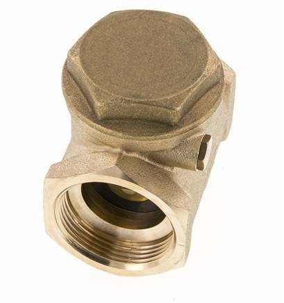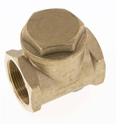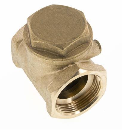 Female threaded G 1 1/2 inch swing check valve made of brass with an NBR sealing. The maximum operating pressure is 10 bar (145 psi). The valve can only be used for liquid media. Due to gravity closing it is suitable only for horizontal installation. Swing check valves offer an unobstructed flow path when fully open and allow for a higher flow rate. The valve is suitable for operating temperatures between 0 and 90 °C (32 and 194 °F).
