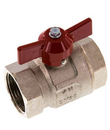 2-way compact ball valve with G 1 inch ports and a butterfly handle for on/off flow control. The valve bore is 25 mm and the maximum pressure is 40 bar or 580 psi. Suitable for water, neutral, gaseous and non-aggressive, liquid media, mineral oils and compressed air. Also suitable for vacuum (max. -0.9 bar or -13 psi). Suitable for temperatures from -20 to 150 °C (-4 to 302 °F). Nickel-plated brass housing, hard chrome plated brass ball and PTFE/NBR sealings.