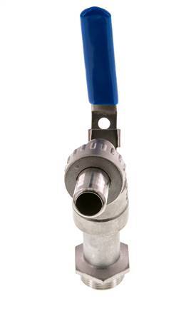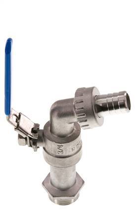 Faucet ball valve with a male G 3/4 inch inlet port and a 16 mm hose barb as outlet port. The valve bore is 13 mm and the maximum pressure is 16 bar or 232 psi. Suitable for water, oil, fuels, compressed air and solvents. Suitable for temperatures from -10 to 150 °C (14 to 302 °F). Stainless steel housing and ball and PTFE/NBR sealings.