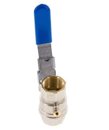 Vented brass ball valve with G 3/4 inch threaded ports. In closed position it vents the outlet port through an M 5 hole. The main valve bore is 20 mm and the maximum pressure is 14 bar or 203 psi. The valve is suitable for air, water and vacuum (max. -0.98 bar or -14 psi). Temperature range is from -10 to 100 °C (14 to 212 °F). Nickel-plated brass housing, hard chrome plated brass ball and PTFE sealings.