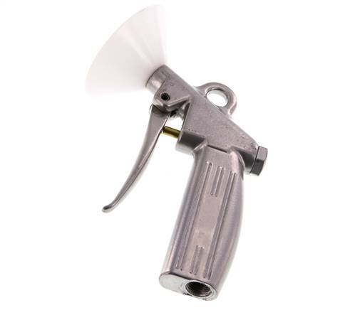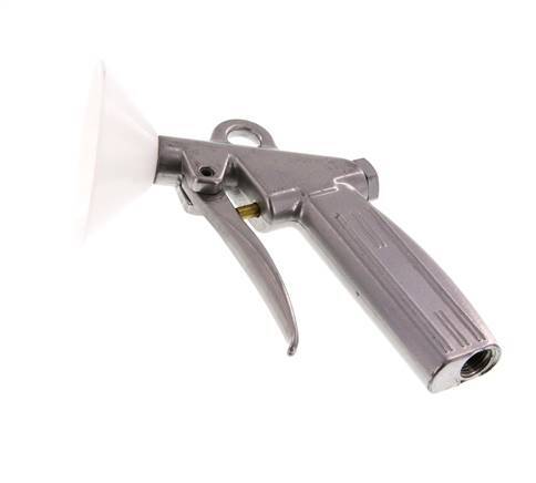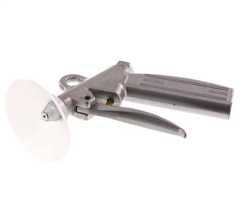 This is an aluminum compressed air blow gun with a G 1/4 inch female threaded inlet port. The blow gun is equipped with a zinc-plated steel nozzle with a protective screen. The screen helps to protect against eye injuries. The screen prevents chips, liquids and other dirt from flying back to the user and cause injuries. Eye injuries are one of the most common hazards when blowing with compressed air. It has a 1.5 mm bore. The nozzle is screwed in a female M12x1.25 threaded outlet port.