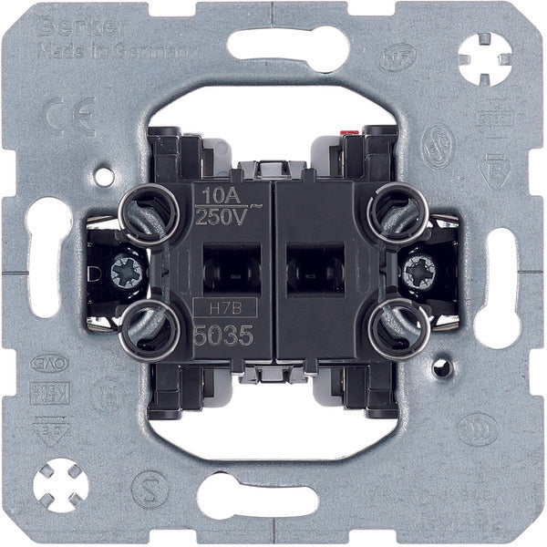 This impulse switch from Hager Berker has a 2 make contact. The series impulse push button only gives a signal when the push button is depressed and is therefore NOT a switch. Shared entrance. With plug-in clamps. This Hager Berker basic element can be combined with a control rocker from the S.1, B.3, B.7, Q.1, Q.3, K.1, K.5, R.1, R.3 and Arsys series.