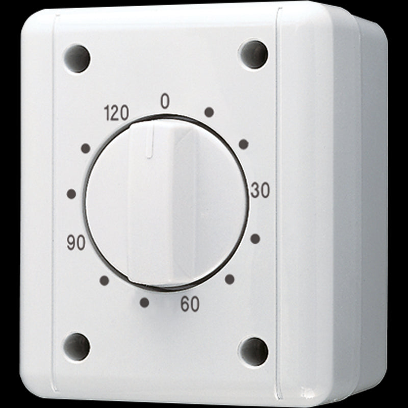 This time switch from Jung's WG 800 series is suitable as a 2-pole time switch that you can control up to 120 mminutes. The time tolerance of the time switchar is ± 10 % and is resetable by sliding clutch. In addition, the time switch has two inputs and screw terminals suitable for wires up to 4mm². The time switch consists of a basic element with a complete housing. In addition, the entire time switch is splash and dust proof (IP44) and can therefore be used both indoors and outdoors. Furthermore, the housing of the timer has a gray color.
