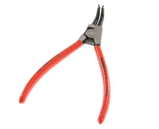 This is a pair of high-quality Knipex outer snap ring angled pliers. It is designed to remove snap rings from 19 to 60 mm shafts. It is made out of chrome-vanadium steel with anti-slip plastic covered handles. Designed in accordance with DIN 5256 Form B.