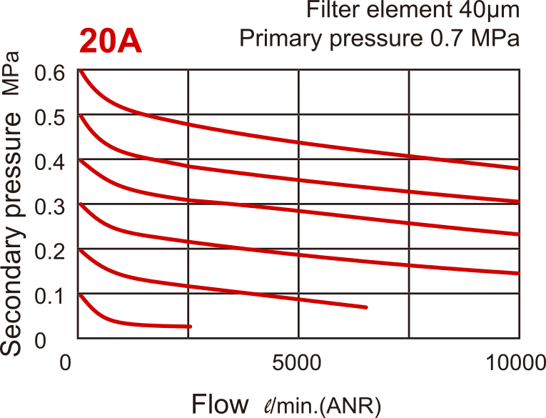 This filter regulator (FR) combines two functions. The filter removes water, dirt and other harmful particles larger than 40 μm for your air system. The pressure regulator adjusts the pressure continuously to a stable level, even when the input pressure varies. The level can be adjusted between 0.1 - 8.5 bar. This model has G 3/4" ports. The maximum flow rate is 10000 l/min. Please note that the maximum flow rate alone doesn’t provide enough information to properly size your filter regulator. Use the flow curve to determine if the pressure drop (droop) within your expected flow rate range is acceptable. The flow curve shows the flow rate for a set input pressure with multiple output pressures. For each output pressure, it can be seen how the pressure changes with increasing flow rate. It is recommended to use the device in the flat range of the curve, and not on the beginning or the end of the curve. Note that the pressure regulator controls the output pressure, not the flow rate. The output pressure can be adjusted by pulling the hand wheel up and twisting. The output pressure can be locked after adjustment by pushing the hand wheel back in. The max input pressure is 10 bar and the temperature range is between -5 and 60 °C. The filter is rated for 40 microns, meaning it will not allow contaminants larger than this through. To empty, it has a semi-auto condensate drain with a drain capacity of 75 cm3. The housing material is made out of aluminium and the filter has a bowl made of Polycarbonate (PC). It has a mounting bracket to mount it to a wall or your machine.