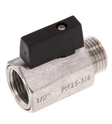 2-Way mini ball valve with G1/2 inch male to female threads and a handle for on/off flow control. 10 mm nominal diameter and a maximum operating pressure of up to 25 bar (363 psi). Suitable for a wide variety of media, ideal for corrosive and aggressive media. Temperature range from -20 to 150 °C (-4 to 302 °F). Stainless steel housing, stainless steel ball and PTFE/FKM seals.