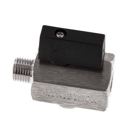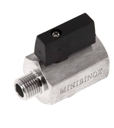 2-Way mini ball valve with G1/4 inch male to female threads and a handle for on/off flow control. 8 mm nominal diameter and a maximum operating pressure of up to 25 bar (363 psi). Suitable for a wide variety of media, ideal for corrosive and aggressive media. Temperature range from -20 to 150 °C (-4 to 302 °F). Stainless steel housing, stainless steel ball and PTFE/FKM seals.