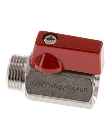 2-Way mini ball valve with G3/8 inch male to female threads and a handle for on/off flow control. 7 mm nominal diameter and a maximum operating pressure of up to 63 bar (914 psi). Suitable for a wide variety of media, ideal for corrosive and aggressive media. Temperature range from -20 to 200 °C (-4 to 392 °F). Stainless steel housing, stainless steel ball and PTFE/FKM seals.