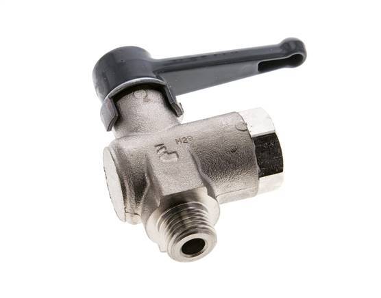This is a right angle brass ball valve. The right angle allows the connection of perpendicularly oriented pipes. The valve bore is 6 mm.