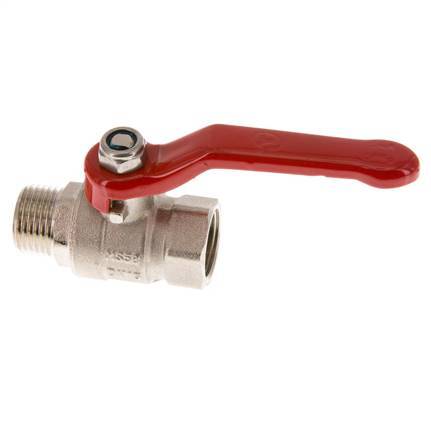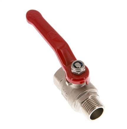 2-way compact PN 25 ball valve with male to female R/Rp 1/2 inch ports and a handle for on/off flow control. The valve bore is 14 mm and the maximum pressure is 25 bar or 363 psi. Suitable for compressed air, water and oils. Suitable for temperatures from -20 to 95 °C (-4 to 203 °F). Nickel-plated brass housing, hard chrome plated brass ball and PTFE/NBR sealings.