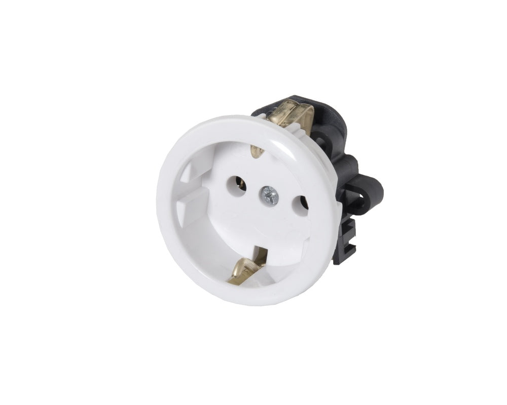 The Martin Kaiser device socket is grounded and edge-grounded, designated as Type F, equipped with a shutter, and is designed as a built-in socket. Rated IP20 for particle resistance, it is installed via screw mounting and utilizes a screw clamp connection technique. This socket can accommodate both solid and flexible wires ranging from 1.5mm2 to 2.5mm2. The device operates at 250V / 16A, and is constructed from thermoplastic material. In terms of aesthetics, it comes in a chalk-white color.