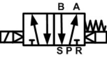 A 5/2-way valve has five ports and two states. Two ports (A and B) connect to a controlled component, for example a double acting cylinder. One port is used to supply pressurized air (port P), the two remaining ports are exhausts (port S and R) and are connected to respectively port B and A. By switching state, either port A is pressurized and port B vented, or port A is vented and port B pressurized. If the valve is used to control a double acting cilinder, one valve state is used to move the cylinder in one direction, and the other state is used to move the cylinder in opposite direction.This valve is single acting, which means that the valve is controlled by one solenoid and returns to the rest position by means of a spring. If the solenoid is not activated, the valve returns to the rest position (right quadrant).