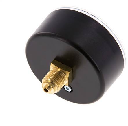 The pressure gauge MW-1063PH is designed for vacuum applications and measures pressures within the range of -1 to 0 bar (-15..0 psi). The gauge has two measurement scales in bar (black) with scale division of 0.05 and in psi (red). The measurement accuracy class is 2.5 (± 2.5 % maximum deviation). The gauge body is made of plastic, the connection and indicator are made of brass. Please make sure that your medium is compatible with brass. The connection point for this manometer is located rear the gauge. As a rule of thumb, please select a pressure gauge that has a rating scale of at least 25% higher than the maximum operating pressure.