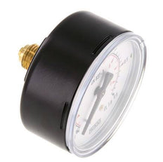 The pressure gauge MW00P663SH is designed for gas and liquid media and measures pressures within the range of 0 to 0.6 bar (0..9 psi). The gauge has two measurement scales in bar (black) with scale division of 0.02 and in psi (red). The measurement accuracy class is 1.6 (± 1.6 % maximum deviation). The gauge body is made of steel, the connection and indicator are made of brass. Please make sure that your medium is compatible with brass. The connection point for this manometer is located rear the gauge. As a rule of thumb, please select a pressure gauge that has a rating scale of at least 25% higher than the maximum operating pressure.