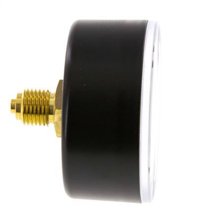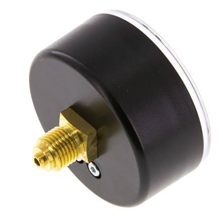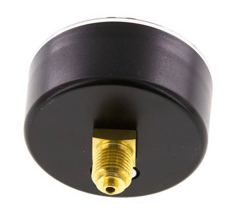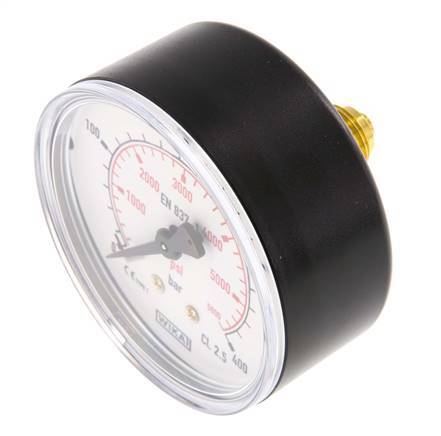 The pressure gauge MW040063PH is designed for gas and liquid media and measures pressures within the range of 0 to 400 bar (0..5802 psi). The gauge has two measurement scales in bar (black) with scale division of 30 and in psi (red). The measurement accuracy class is 2.5 (± 2.5 % maximum deviation). The gauge body is made of plastic, the connection and indicator are made of brass. Please make sure that your medium is compatible with brass. The connection point for this manometer is located rear the gauge. As a rule of thumb, please select a pressure gauge that has a rating scale of at least 25% higher than the maximum operating pressure.