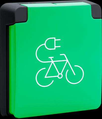 Splashproof bicycle charging point 16 A/250 Vac with protective earth, child safety and with plug-in terminals, excluding surface-mounted box. Socket is completely covered by an upward-hinged protective cover. Color: green/black.