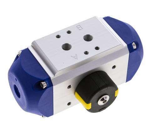 This pneumatic actuator allows you to control quarter turn (ball or butterfly) valves with compressed air generating 4.5 Nm of torque at 6 bar, but it has a control pressure window of 6-10 bar to increase/decrease torque. Compatible with ISO 5211 F04 valves. It is spring open and has a reliable rack and pinion system. The ambient temperature range is -20°C to 80°C and it has ATEX (EX II 2GD c) certification. The actuator has G 1/8 inch air ports and a 1/4 inch Namur interface to directly mount a solenoid valve.