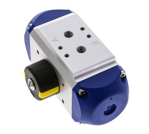 Adding a pneumatic actuator to a ball or butterfly quarter turn valve allows them to be remote controlled with compressed air to increase system automation. Pneumatic actuators are a reliable solution to control larger valves at a relatively low investment cost. These valves commonly have an ISO 5211 mounting flange, so they are prepared for an actuator. This actuator is compatible with ISO 5211 F04 valves and has a 11 mm star connection for square drive shafts. The shaft size can be reduced using adapters. Please carefully check the datasheet and the flange dimensions of your valve, as there are many variations on the market. This actuator generates 4.5 Nm of torque at 6 bar, but it has a control pressure window of 6-10 bar to increase/decrease torque. The actuator is single acting spring open to conserve on compressed air and it returns automatically to starting position in case of air or power loss. It is designed with a reliable aluminum rack and pinion rot ational operation. Using throttle valves on the outlet ports (after the solenoid valve) allows the adjustment of the rotational speed. These actuators are durable with an anodized aluminum housing and an acetal resin cover. Due to the NBR seal, the temperature range is -20°C to 80°C. The actuator has G 1/8 inch ports for the air supply and return. We recommend mounting a 1/4 inch Namur solenoid valve directly onto the actuator to control the air supply. Please note that 1/4 refers to the Namur size of the valve, not the port size. Also, a position control or limit switch box can be mounted on the top of the actuator according to VDI/VDE 3845. The actuator is ATEX certified (EX II 2GD c) and may therefore be used in potentially explosive environments.