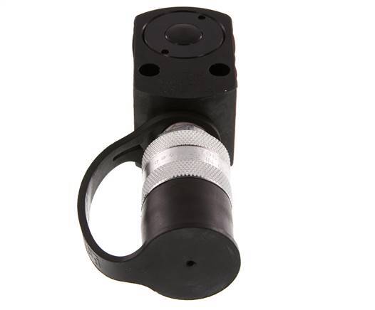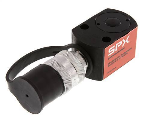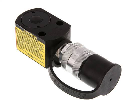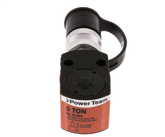 This is a Power Team single-acting, spring return, flat 5 ton hydraulic jack cylinder designed for use in confined working areas. The jack has a stroke length of 14.3 mm, with a 41.3 mm height when the piston rod is retracted.