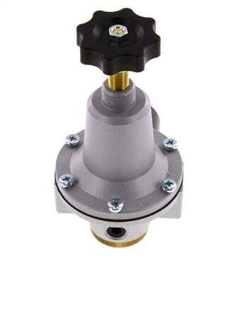 This manually adjustable pressure relief valve is used to protect pneumatic devices from damage caused by overpressure. If the pressure at the inlet exceeds the set pressure, the valve will release pressure to the outlet side. This pressure relief valve has a G 1/2 inch inlet and outlet ports. The reaction pressure can be set between 0.1 and 3 bar (1.45-43.51 psi) and the maximum overpressure is 1 bar (14.5 psi). The maximum overpressure is the amount by which the actual inlet pressure can exceed the set pressure when the maximum flow rate is reached. The maximum flow rate is 2000 l/min. The housing is made of zinc die-cast and the sealing from NBR. Suitable for a temperature range of -10 and 60 °C (14 and 140 °F). It has a pressure gauge with a 0 - 6 bar display range. Despite being similar in function, this valve cannot replace a safety valve and cannot be used to regulate the outlet pressure.