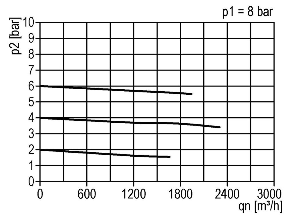 The pressure regulator adjusts the pressure continuously to a stable level, even when the input pressure varies. The level can be adjusted between 0.5 to 10.0 bar (7 to 145 psi). This model has G 1 1/2 inch ports. The maximum flow rate is 31500 l/min. Please note that the maximum flow rate alone doesn't provide enough information to proper sizing. Use the flow curve to determine if the pressure drop (droop) within your expected flow rate range is acceptable. The flow curve shows the flow rate for a set input pressure with multiple output pressures. For each output pressure, it can be seen how the pressure changes with increasing flow rate. It is recommended to use the device in the flat range of the curve, and not on the beginning or the end of the curve. Note that the pressure regulator controls the output pressure, not the flow rate. The output pressure can be adjusted by pulling the hand wheel up and twisting. It can be locked after adjustment by pushing the hand wheel back in.