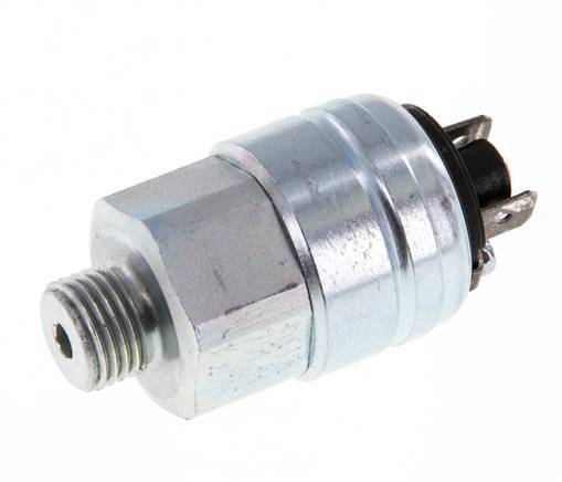 This is a mechanical pressure switch with normally closed (NC, SPST (single pole, single throw)) contacts. If the application pressure greater than setpoint pressure the contacts open the circuit. The setpoint is the pressure value where the switch activates and the reset point is the value at which the switch deactivates when the pressure decreases. The setpoint can be adjusted between 100 and 350 bar (1450 and 5076 psi). The maximum overpressure is 500 bar (7252 psi). It has a switch hysteresis (the difference between setpoint and reset point) of 10 - 15%. The switching capacity for this pressure switch is 5 A @ 42 V AC or 5 A @ 30 V DC. It can be connected to an electrical network with a flat connector. This pressure switch is made in a piston design with a steel body and a UR seal. It is suitable for various media, such as compressed air, hydraulic oil and in a temperature range from -25 to 85°C (from -13 to 185°F). The connection port has a size of G 1/4 inch with male threads. The pressure switch has an IP65 rating.