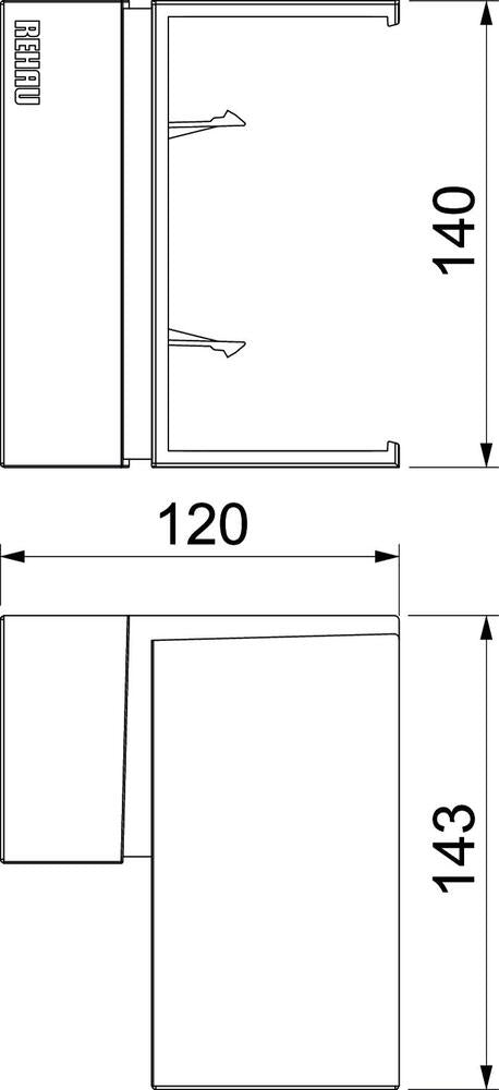 Rehau by Obo SIGNA inside corner piece wall channel hood form part, plastic, pure white, (wxd) 143x140mm, asymmetrical, cover fixing outside, halogen-free, angle 85 - 93°, quality class other, surface protection none (untreated), RAL number 9010.