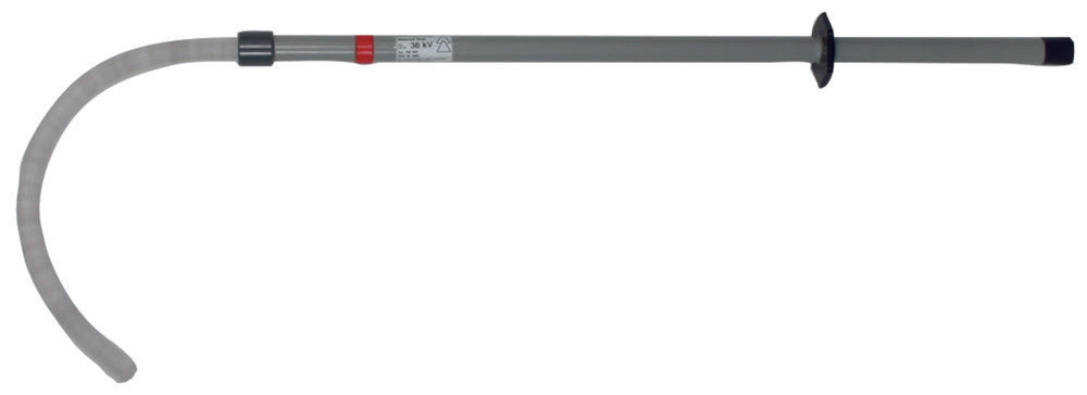 This is an insulating stick compliant with DIN VDE 0681-1, designed for use as a rescue rod in case of electrical accidents. The device type is a rescue rod with a diameter of 30mm and a total length of 1235mm, capable of submersion up to a depth of 410mm. It can be used in both indoor and outdoor installations and is rated for nominal voltages between 1-36kV. The rod is effective for working under tension and is made from solid plastic, equipped with protection against electrical bridging.