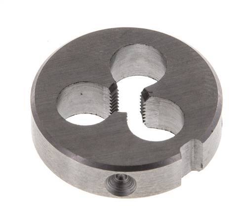 This is a shape B round die for external fine M4 thread cutting (male threads). It is 5 mm thick and cuts a 0.5 mm thread pitch.